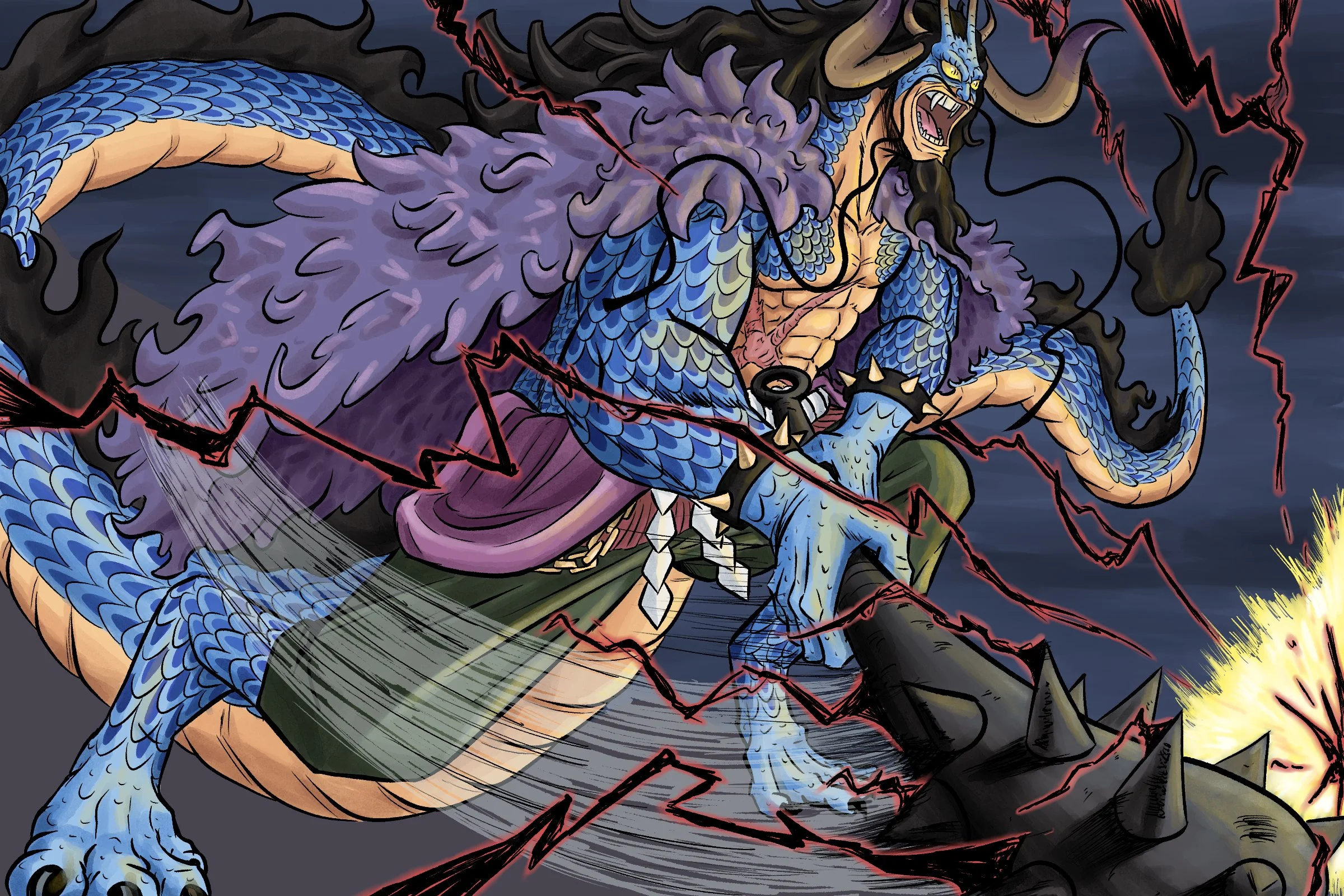 Caught in a fight over the Land of Wano, Emperor Kaido clashes with Straw Hat Luffy. Fan art of One Piece character; Kaido, King of the Beast. (2023)